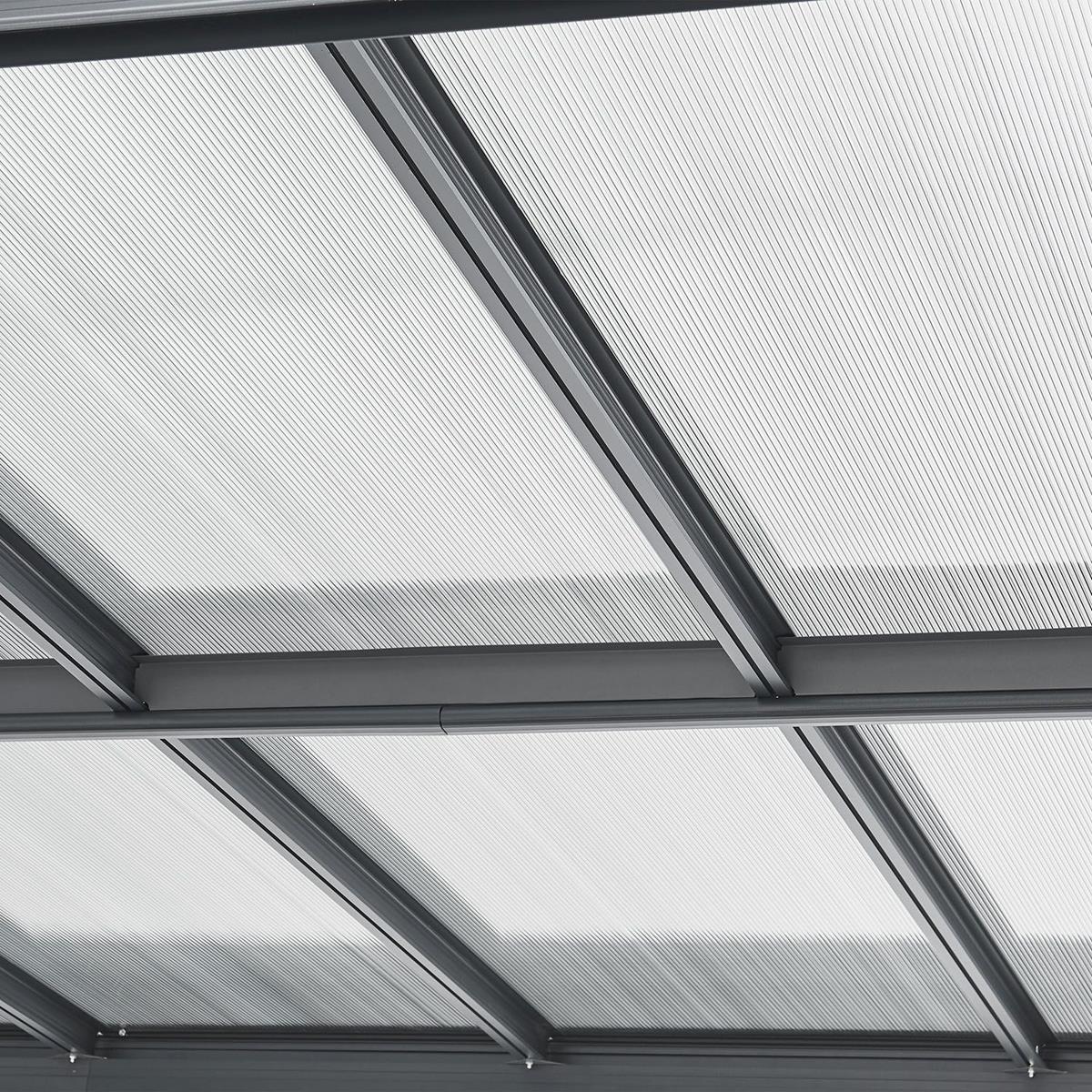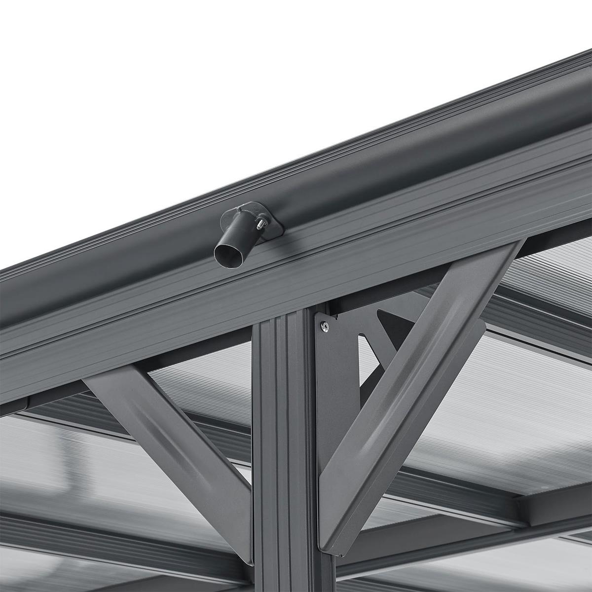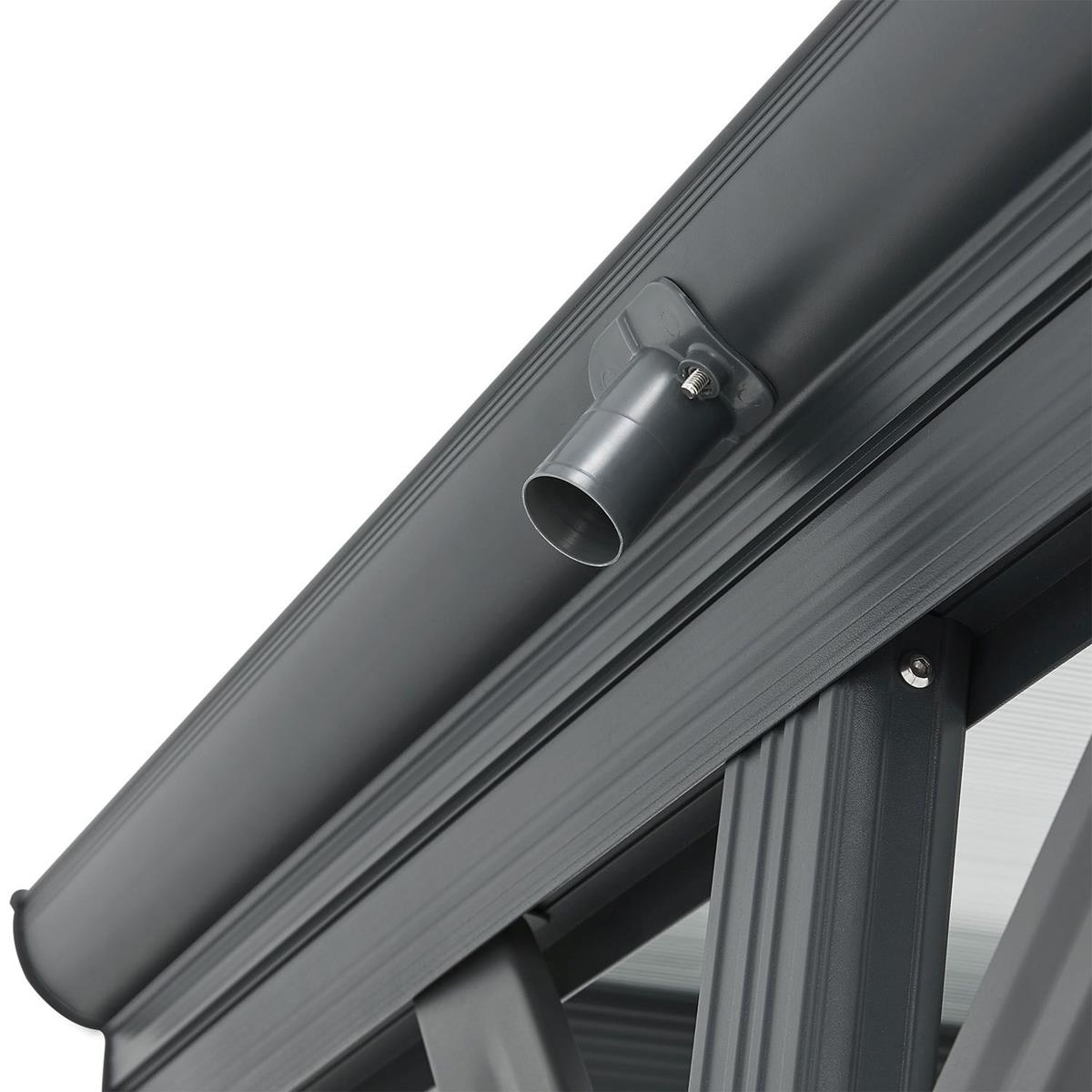 The high-quality roofing consists of a powder-coated, stable aluminium frame (material thickness 1.2 mm), which is weatherproof and particularly hard-wearing, ensuring that the carport can be used for a long time. The material is characterised by its high load-bearing capacity and UV resistance. You will therefore enjoy this carport for a long time, even after many years of use. In addition, the construction of the roof is designed in such a way that no water remains on it and always drains off to the gutters.