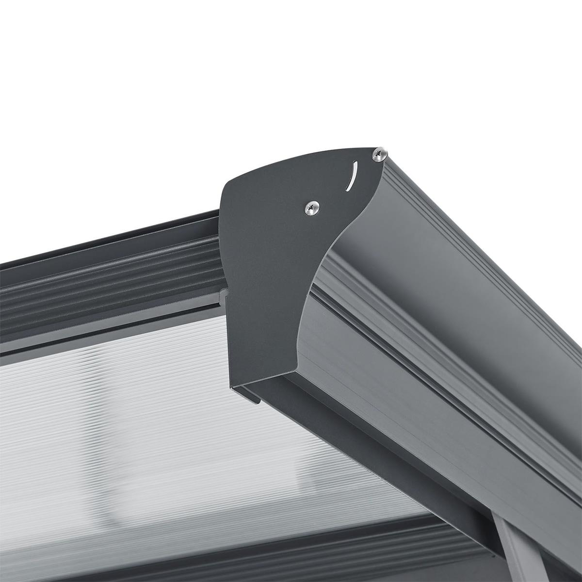 Finally an affordable and functionally practical carport with flat roof for your beloved car, motorbike, trailer or small boat which is protected from rain, sun and snow. The roofing is supplied with grey translucent and stable double web panels made of robust polycarbonate (thickness 6 mm). The stylish carport is relatively quick to assemble and you can simply attach it to solid surfaces using the fastening materials supplied (instructions included). In addition, it can withstand loads of up to 100 kg/m² (snow load). To allow the surface water to drain off in a controlled manner when it rains, there are practical rain gutters including drains on the sides. Thanks to its modern and elegant design, the roofing particularly enhances every courtyard entrance. We also offer this carport with an arched roof.