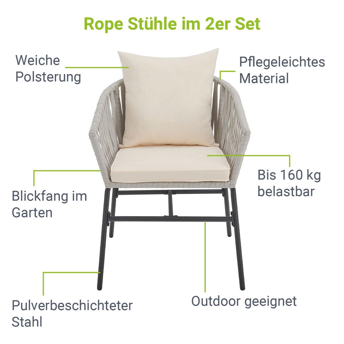 The dream of a perfect terrace can come true for you with these sturdy balcony chairs. With these beautiful garden chairs, you get pure luxury for your garden, terrace or balcony. The chairs are covered with a high-quality rope mesh (100% polypropylene). The elastic rope mesh ensures a pleasant and comfortable seating comfort. The modern shape and high-quality workmanship of the entire chair is an absolute eye-catcher in your garden.