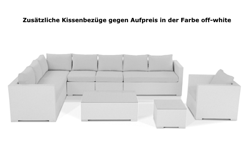The precious cushions (6x) and pillows (10x, Höhe 11 cm) are grey and grant your garden lounge with special elegance. Moreover the coating is water-repellant and therefore very easy to keep them clean. Dirt smudges can easily be wiped away or even washed out because due to a covered zipper you may remove the pillowslip (100% polyester) and wash them at 40°. Besides, the pillows are extremely nice and fluffy stuffed and you won’t fail to achieve your desired feel-good experience.