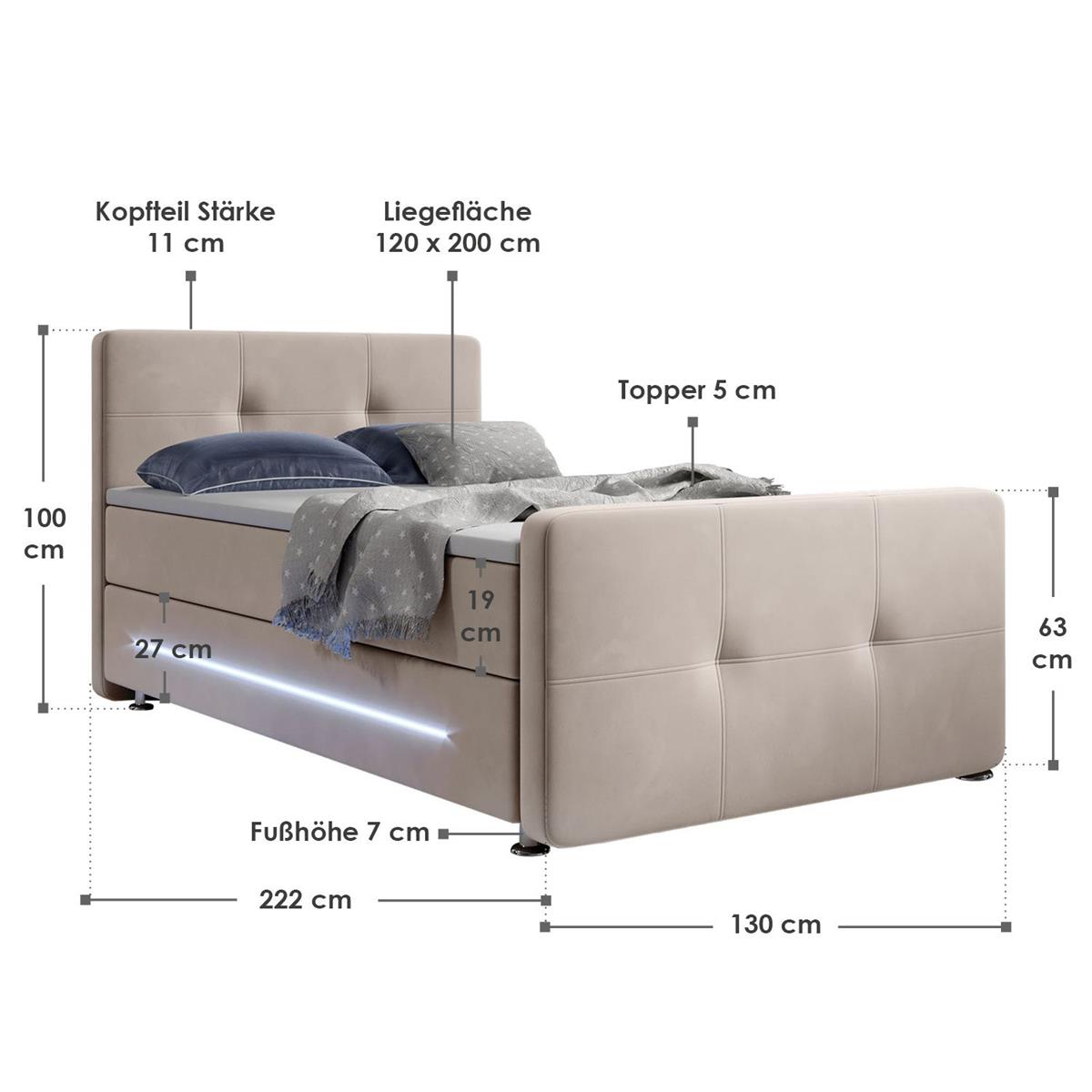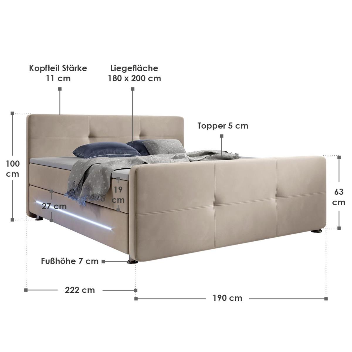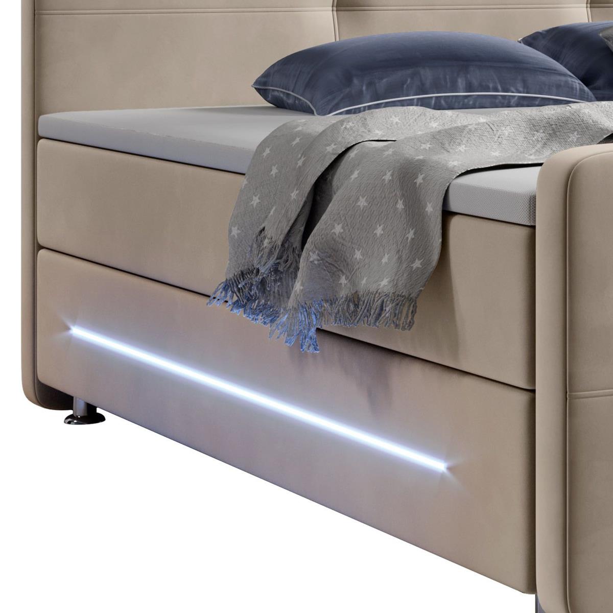 box spring bed Havanna with fabric cover grey or beige with LED lighting, mattress and topper pad 120 / 140 / 180 x 200 cm