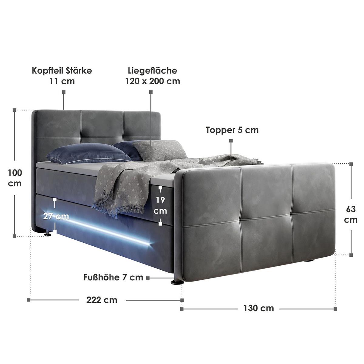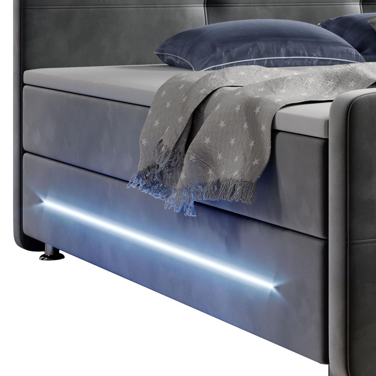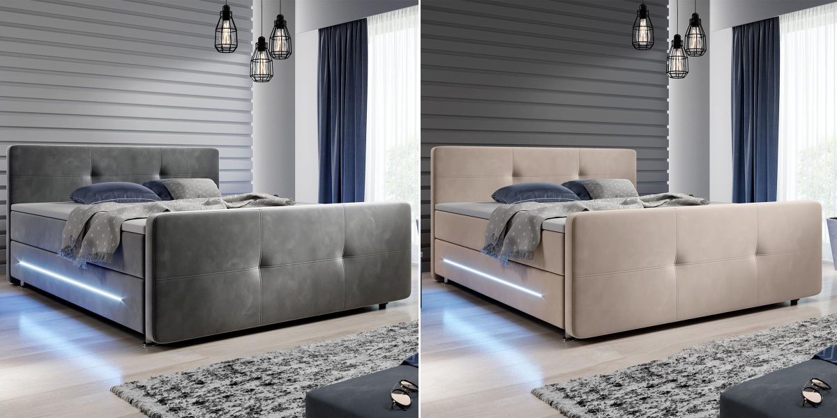 box spring bed Havanna with fabric cover grey or beige with LED lighting, mattress and topper pad 120 / 140 / 180 x 200 cm