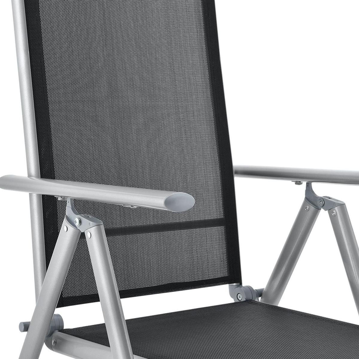 Der Traum einer perfekten Terrasse, kann mit dieser traumhaften Sitzgruppe für Sie wahr werden. Mit dieser wunderschönen Aluminium Gartenmöbel Sitzgruppe, erhalten Sie Luxus pur für Ihren Garten, Terrasse oder Balkon. Die Stühle sind mit hochwertigem Textilgewebe bespannt (70 % PVC + 30 % Polyester). Das elastische Textilgewebe, welches mit PVC ummantelt ist (dadurch flexibel, wasserabweisend und reißfest) sorgt für einen angenehmen und bequemen Sitzkomfort. Die Stühle haben zudem eine verstellbare Rückenlehne und können platzsparend zusammen geklappt werden. Die exklusive Form und hochwertige Verarbeitung der gesamten Essgruppe ist ein absoluter Blickfang in Ihrem Garten.