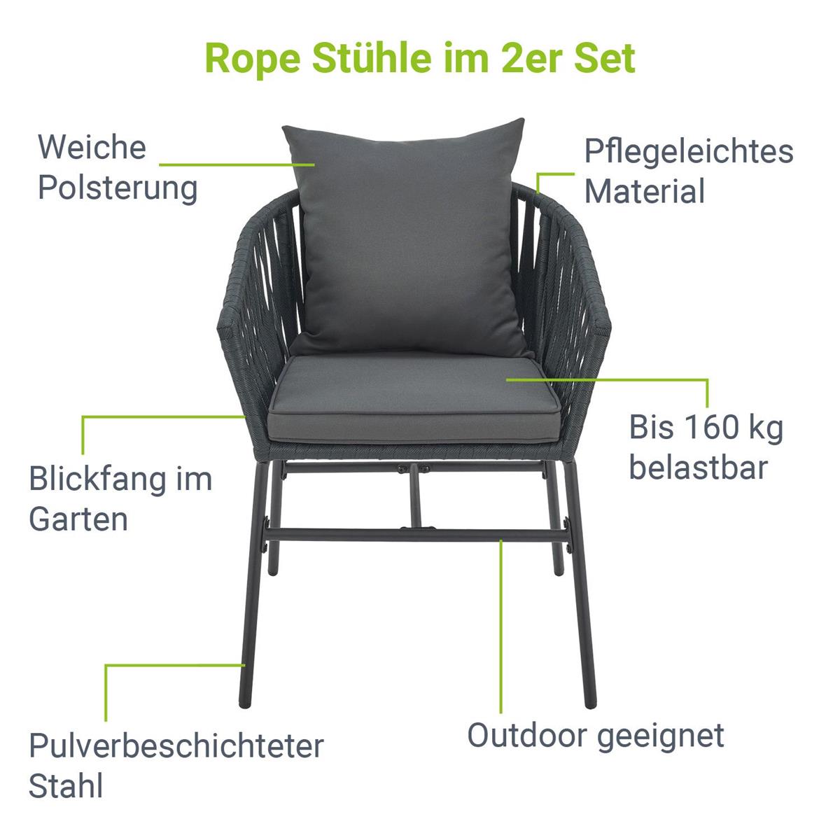 Designer Gartenstühle "Riga" 2er Set der Luxusklasse inkl. Sitzkissen und Rückenkissen mit hochwertigen Seilgeflecht und massiven Stahl Gestell - 6 teilig - das exklusive Gartenmöbel Set für Ihren Garten, Balkon oder Ihre Terrasse