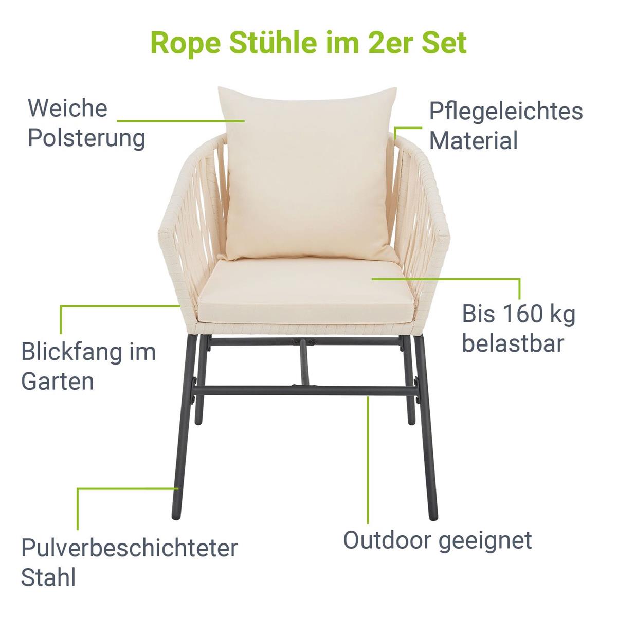 Der Traum einer perfekten Terrasse, kann mit diesen stabilen Balkonstühlen für Sie wahr werden. Mit diesen wunderschönen Gartenstühlen, erhalten Sie Luxus pur für Ihren Garten, Terrasse oder Balkon. Die Stühle sind mit einem hochwertigen Seilgeflecht bespannt (100 % Polypropylen). Das elastische Seilgeflecht sorgt für einen angenehmen und bequemen Sitzkomfort. Die moderne Form und hochwertige Verarbeitung der gesamten Stühle ist ein absoluter Blickfang in Ihrem Garten.
