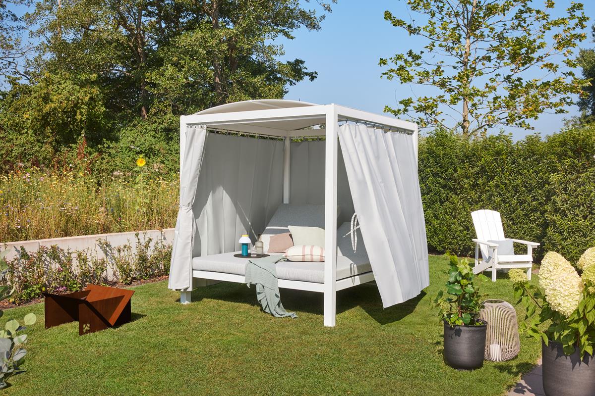 Alle Liegenauflagen und Vorhänge sind bereits inklusive. Die Vorhänge und das Dach sind wasserabweisend