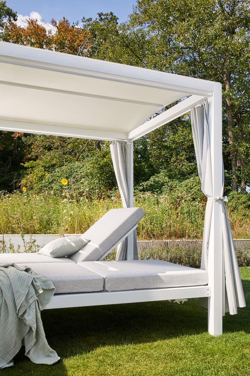 Designer Garten Pavillon London Gartenliege Gartenpavillon Sonneninsel Liege Gartenmöbel Sonnenliege Sonnenschutz Windschutz weiss