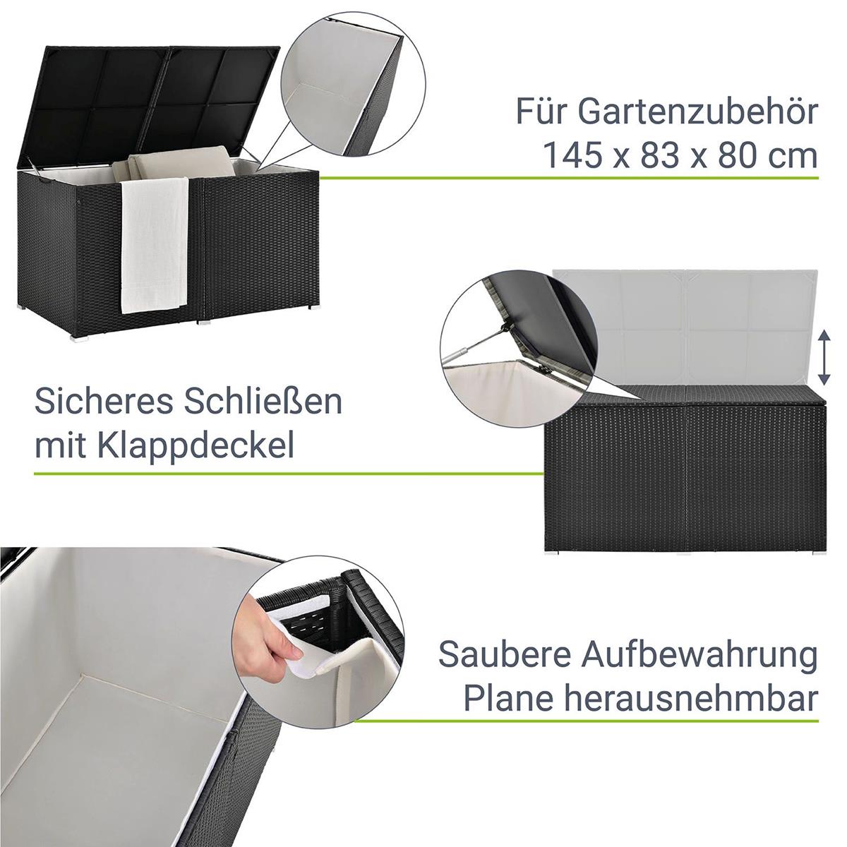 XXL Garten Rattanbox "Island" 145 cm / 950 Liter - mit Tragegriffen - die edle Stauraum Kissenbox für Ihre Kissen, Polster oder Auflagen Ihrer Gartenmöbel