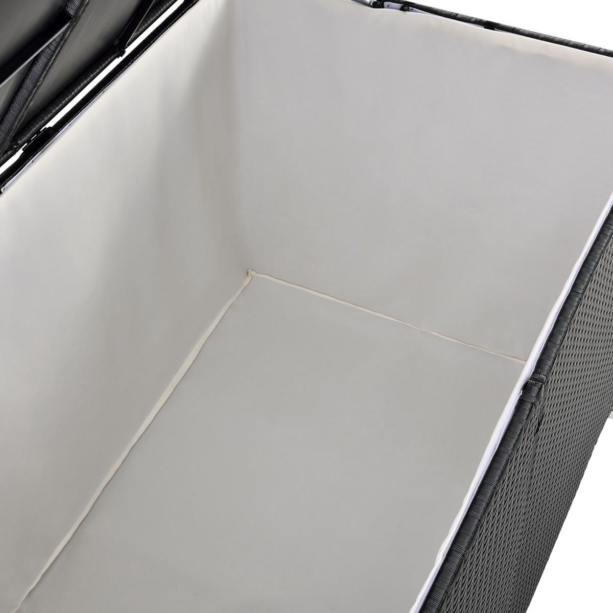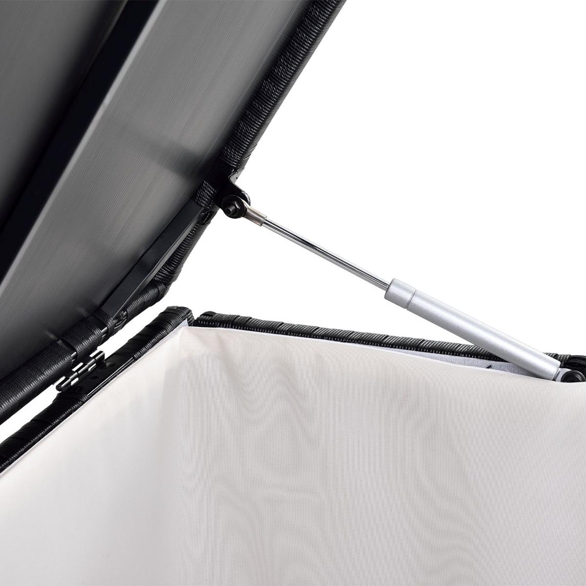 Der Traum einer perfekten Terrasse, kann hier wahr werden. Mit dieser edlen Designer XXL Gartenmöbel Kissenbox holen Sie sich Luxus pur in den eigenen Garten. Diese eignet sich dank Ihrem enormen Fassungsvermögen von 950 Liter (!) ideal zur Aufbewahrung Ihrer Kissen, Polster, Liegeauflagen oder sonstige Gegenstände. Mittels der zwei komfortablen Gasdruckdämpfer lässt sich der Deckel besonders einfach öffnen und hochstellen. Hierdurch können Sie ohne den Deckel festhalten zu müssen, kinderleicht Alles aus- und einräumen. Zusätzlich sorgt die mitgelieferte Innenhülle (100% Polyester) zum Schutz vor Insekten und Schmutz. Sie können die Innenhülle auch entnehmen und sie ist abwaschbar.