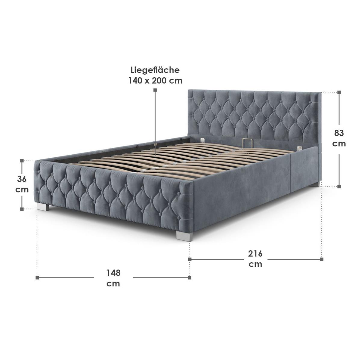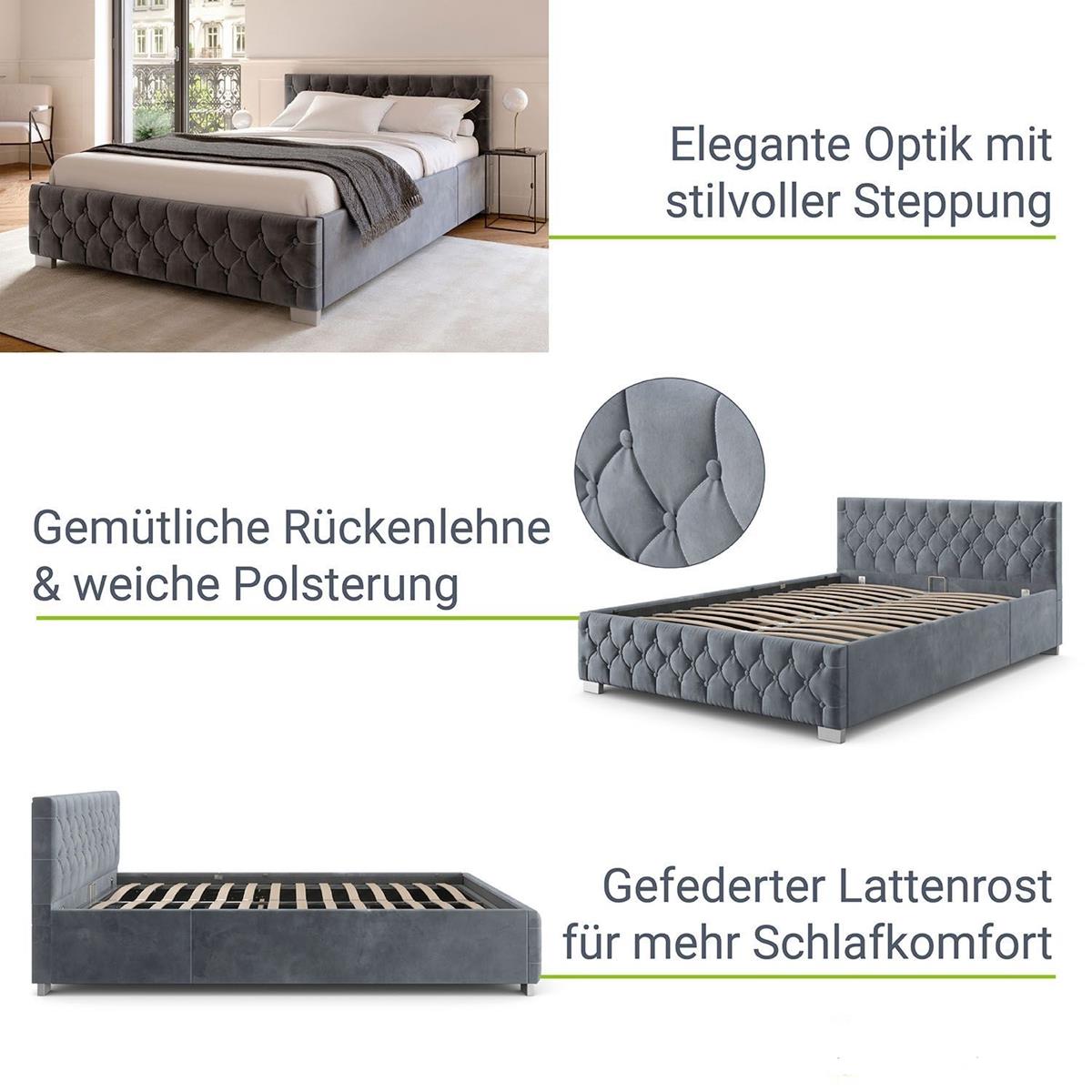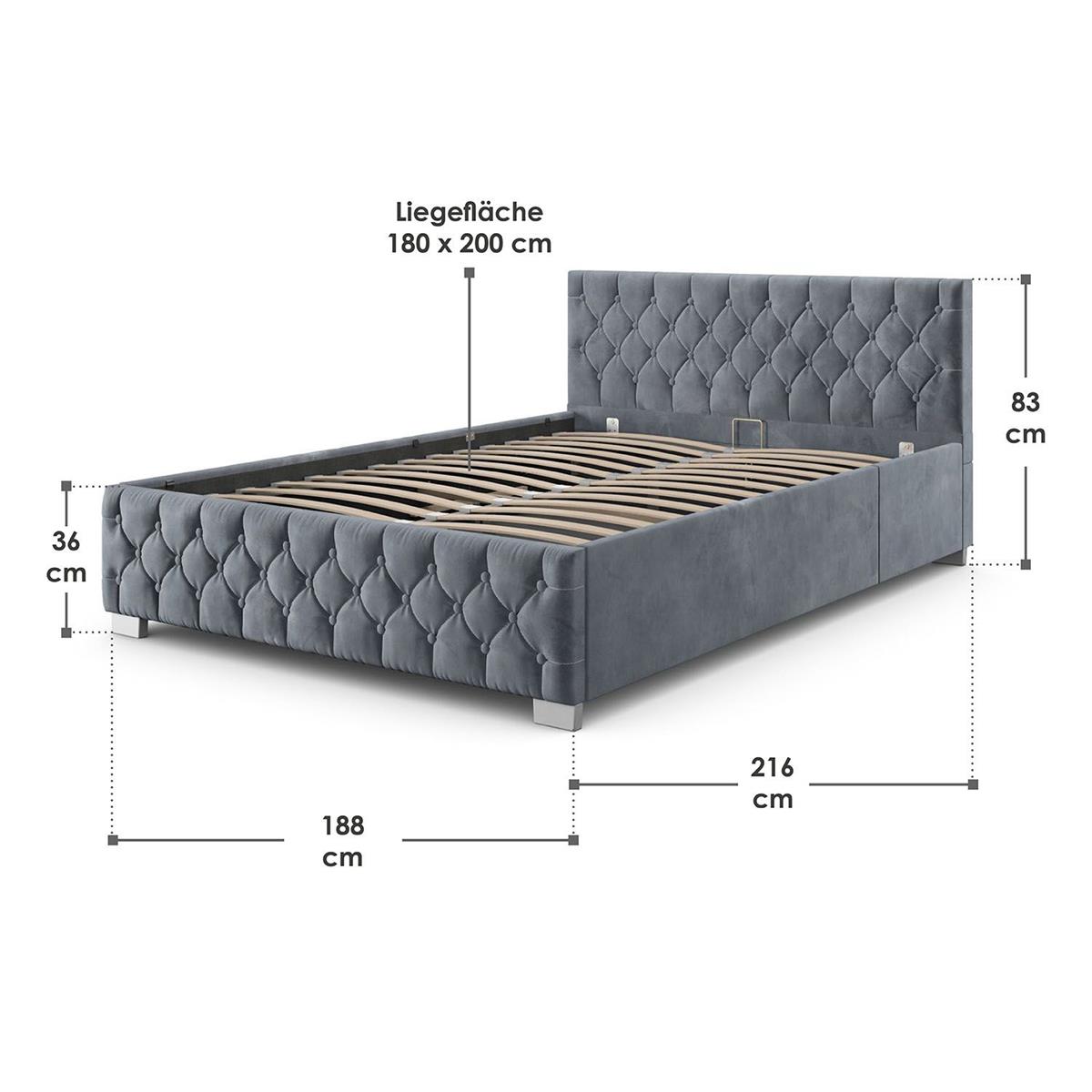 Designer Polsterbett Namur mit Samtbezug grau mit Bettkasten Stauraum Lattenrost extra hohes Kopfteil 120 / 140 / 180 x 200 cm