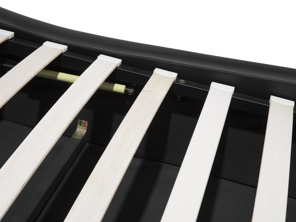 Der Lattenrahmen ist bei diesem Bett bereits inklusive und besteht aus stabilem schwarz lackierten Stahl mit 26 Federholzleisten, aus dauerelastischen Pappelholz, welche in flexiblen Kautschukkappen gelagert werden. Der Rost eignet sich bis 120 kg pro Person. Beim Maß 160x200 cm ist der Lattenrost mit 2 Liegeflächen á 80x200 cm und beim Maß 180x200 cm mit 2 Liegeflächen á 90x200 cm ausgestattet.