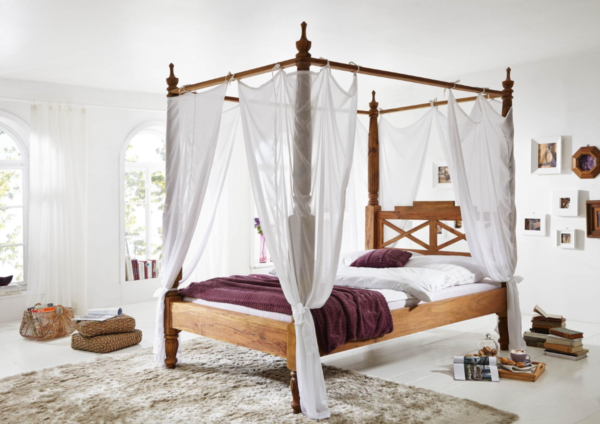 Weiterführende Links zu "Massivholz Himmelbett aus Sheesham Palisander Holz Braun mit Bezugstoff weiss Luxus Traumbett günstig"