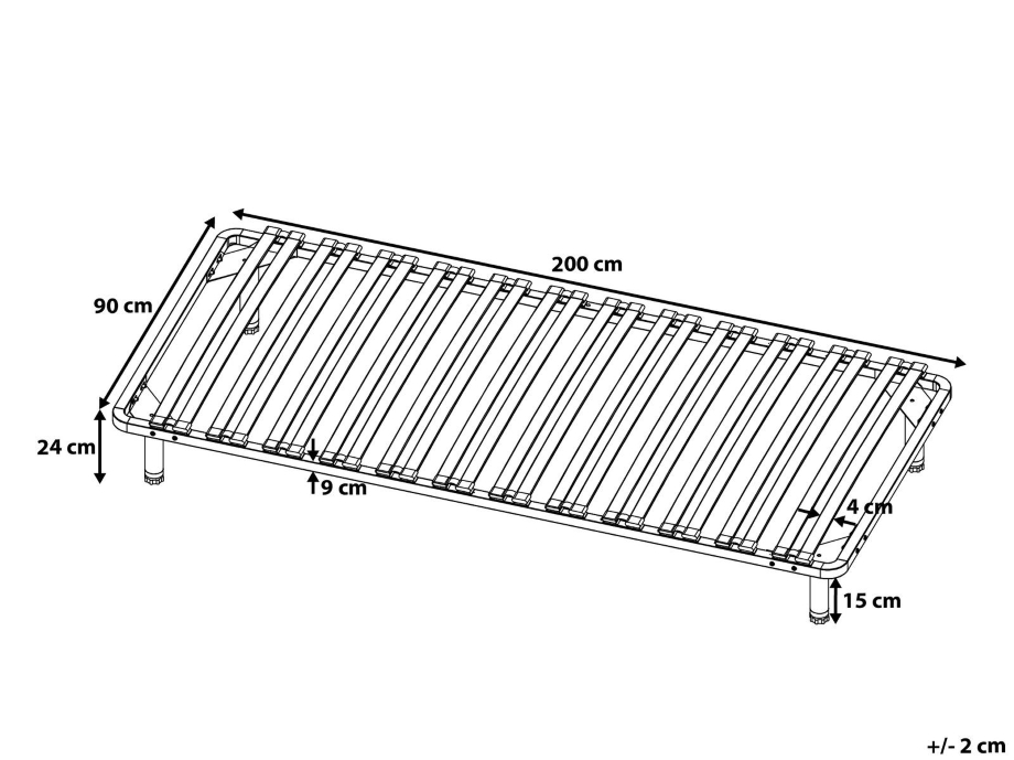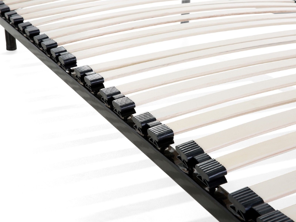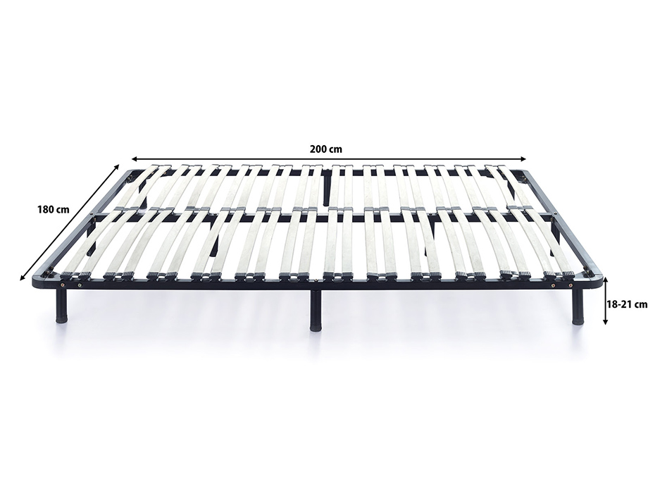 Der Rahmen besteht aus schwarz lackierten Stahlrohren, die mit variablen Standfüßen für hohe Belastungen von bis zu 150 kg pro Person ausgelegt wurden. Die 24 / 48 flexiblen Federholzleisten aus sehr massiven Pappelholz sind in elastischen Duo-Kautschukkappen gesteckt und stellen die notwendige Unterstützung und zusätzliche Druckentlastung zu Ihrer Matratze sicher! Die Liegefläche beträgt 90x200 cm oder bei 140x200 2x 70x200 cm oder bei 160x200 2x 80x200 cm oder bei 180x200 2x 90x200 cm. Die Federholzleisten sind holmübergreifend und überdecken somit auch den Außenrahmen.