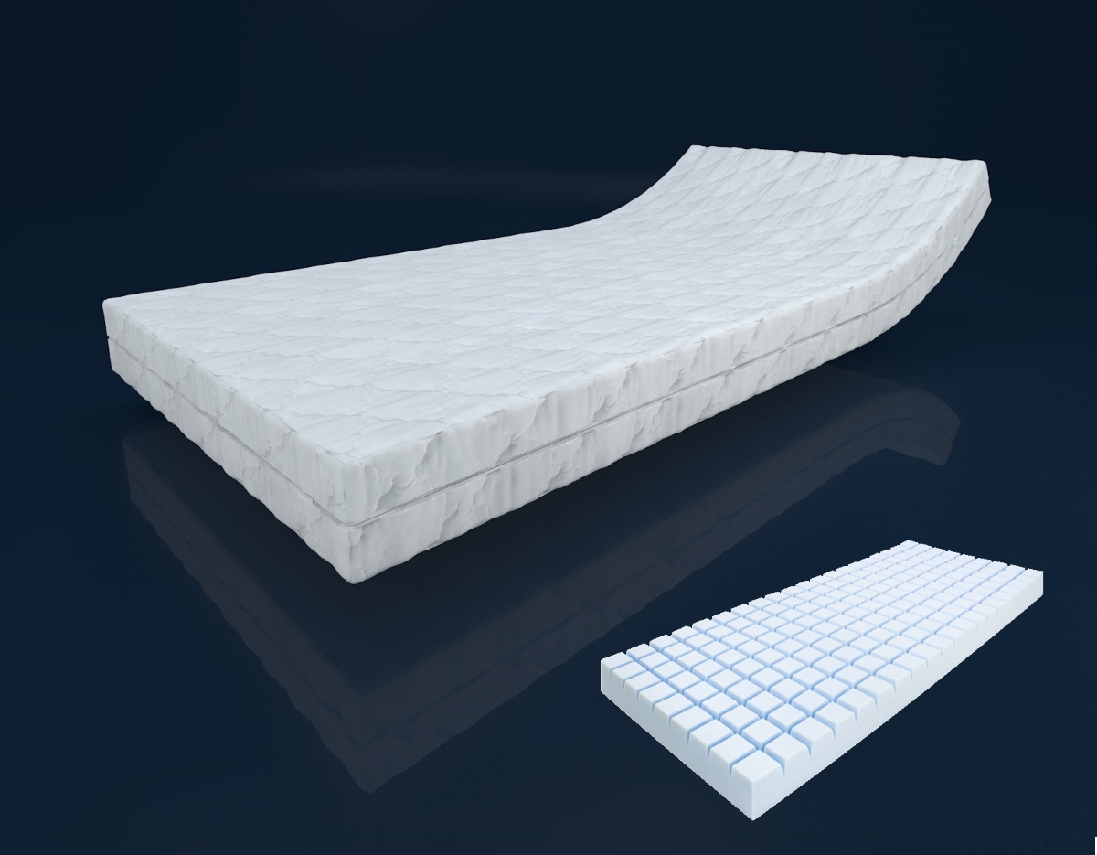 Der Matratzenkern besteht aus einem 14 oder 19 cm hohen orthopädischen Kaltschaum, welcher wahlweise in H2 = mittel oder H3 = fest oder H4 = sehr fest gefertigt wird. Auf der Oberseite befinden sich unterschiedlich große spezielle 3D Würfeleinschnitte die 7 Liegezonen ermöglichen (RG30). Die andere Seite besteht aus einem glatten Kaltschaum, der ein leicht stützkräftigeres Liegegefühl ermöglicht.