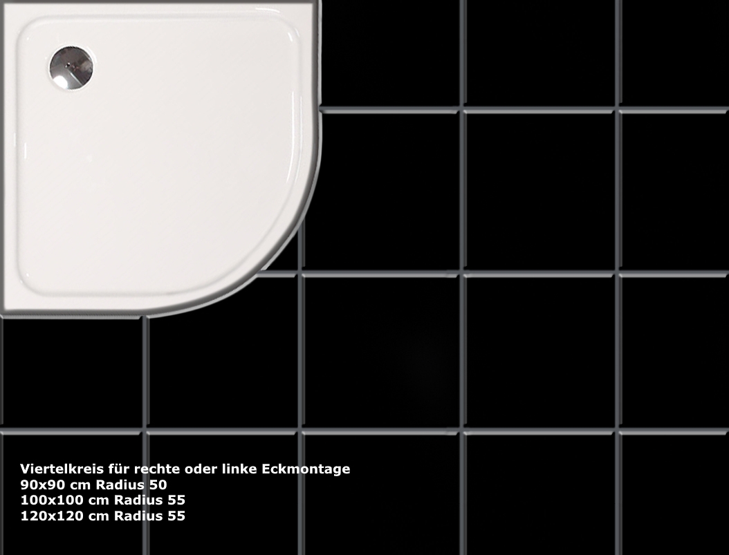 - Erhältlich in viertelkreis 90x90 cm Radius 50 + 100x100 cm Radius 55 + 120x120 cm Radius 55 (für rechte + linke Eckmontage)