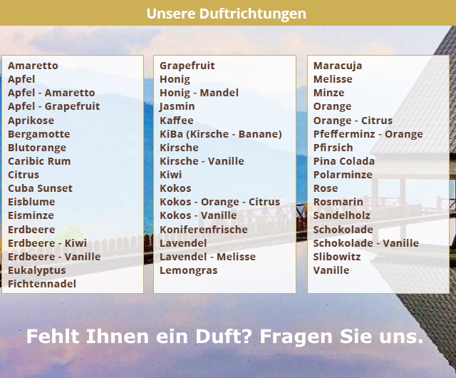 Machen Sie Ihr Badeerlebnis zu einer besonderen Reise durch die faszinierende Welt der Düfte! Sollte Ihnen ein Duft fehlen, kontaktieren Sie uns einfach.