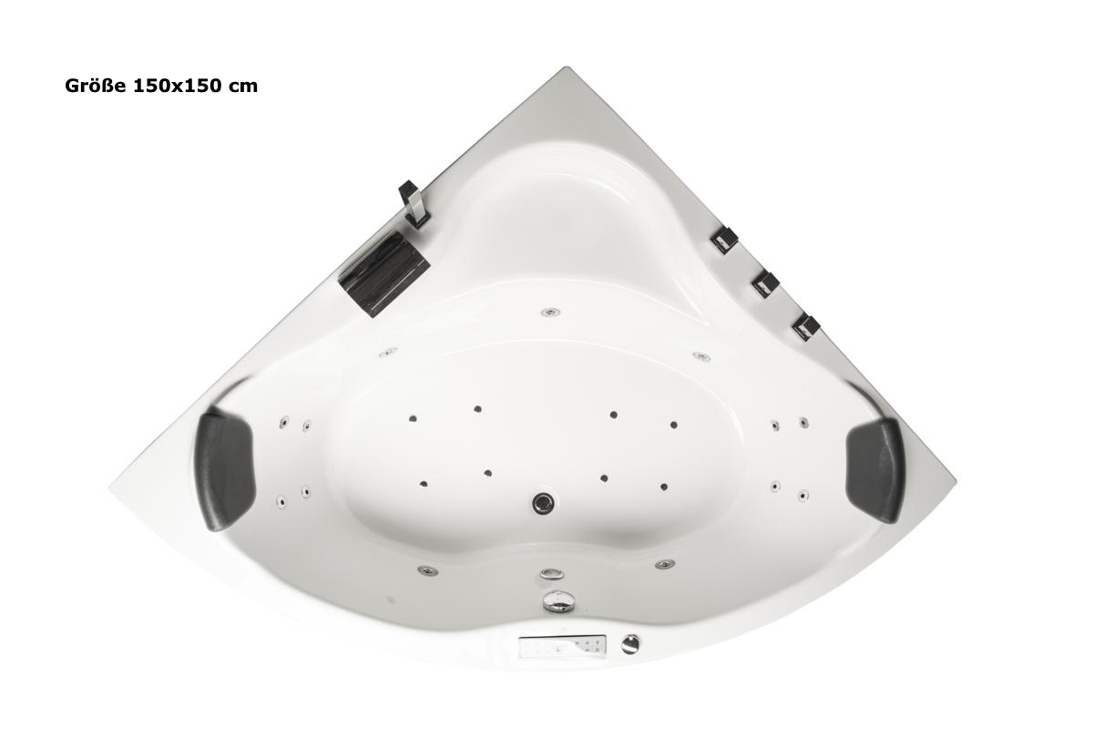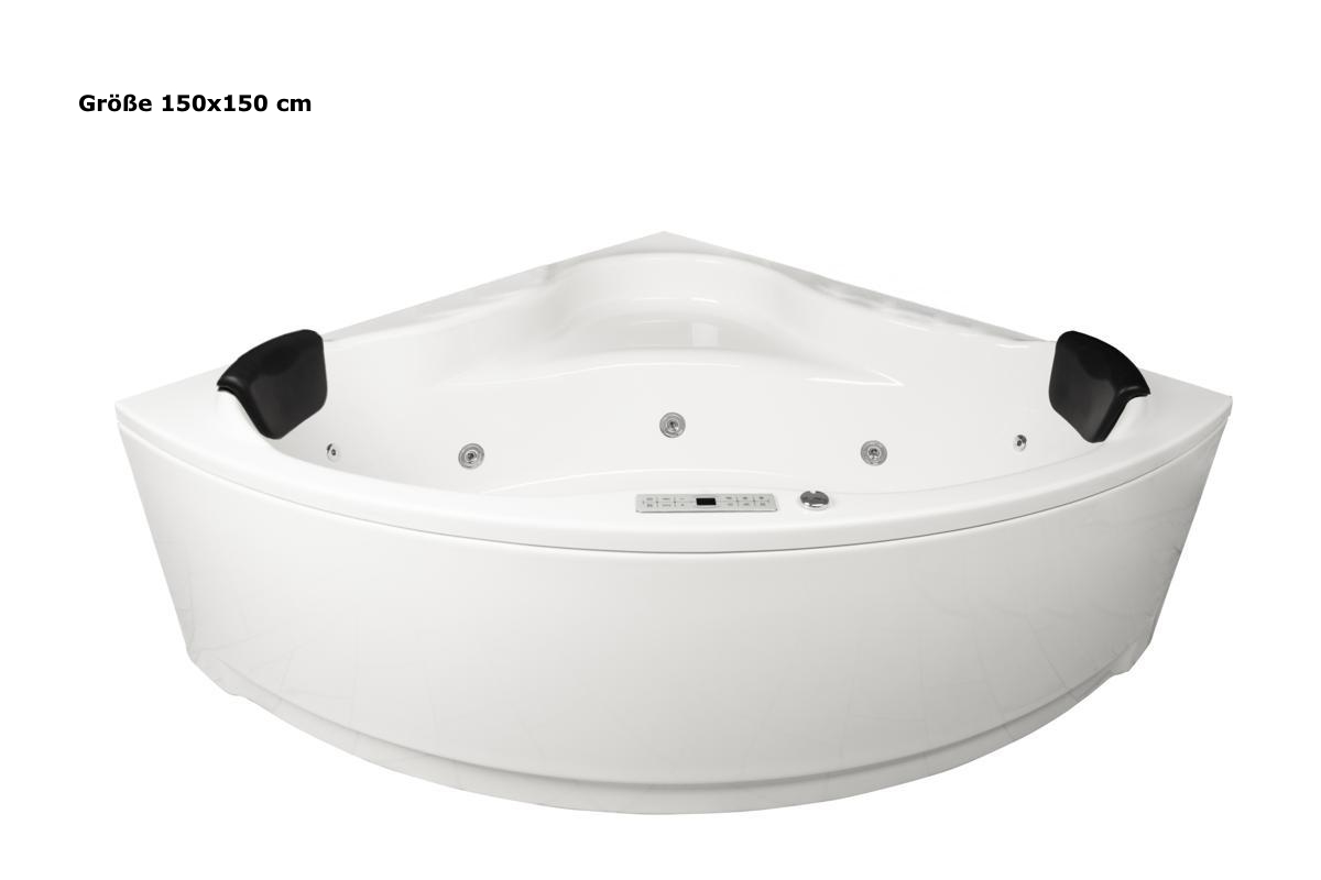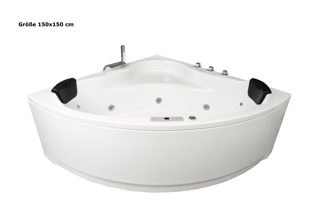 Foto zeigt Größe 150x150x59 cm mit Armaturen und Schürze (nur die Größe 150x150 cm hat eine Erhöhung unter den Kopfstützen)