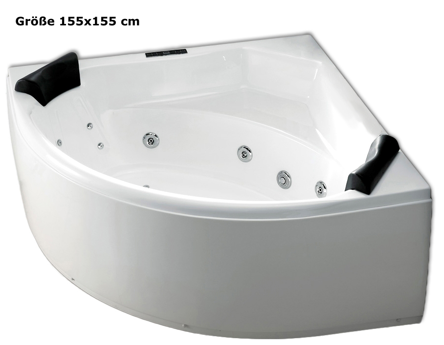 - Der Whirlpool fasst ca. 150 Liter Wasser (bei 130 cm), 170 Liter Wasser (bei 140 cm), 190 Liter (bei 150 cm), 250 Liter (bei 155 cm) inkl. 1-2 Personen in der Badewanne.