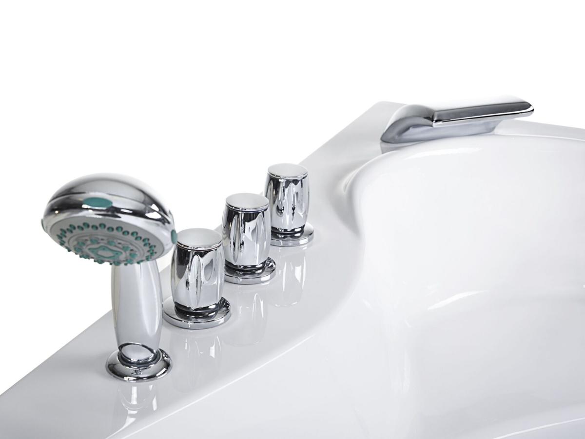 - Die luxuriösen Armaturen sind qualitativ anspruchsvoll verchromt, sind sehr übersichtlich in der Anordnung und einfach in der Bedienbarkeit. Der Brauseschlauch der Anti-Kalk Handbrause ist platzsparend in der Wannenverkleidung angebracht und lässt sich leicht zu jedem gewünschten Punkt in der Badewanne herausziehen. Danach kann er wieder in die Vorrichtung zurück. Dadurch wird Sie der Schlauch beim Baden nie stören, wie bei herkömmlichen Badewannen der Fall
