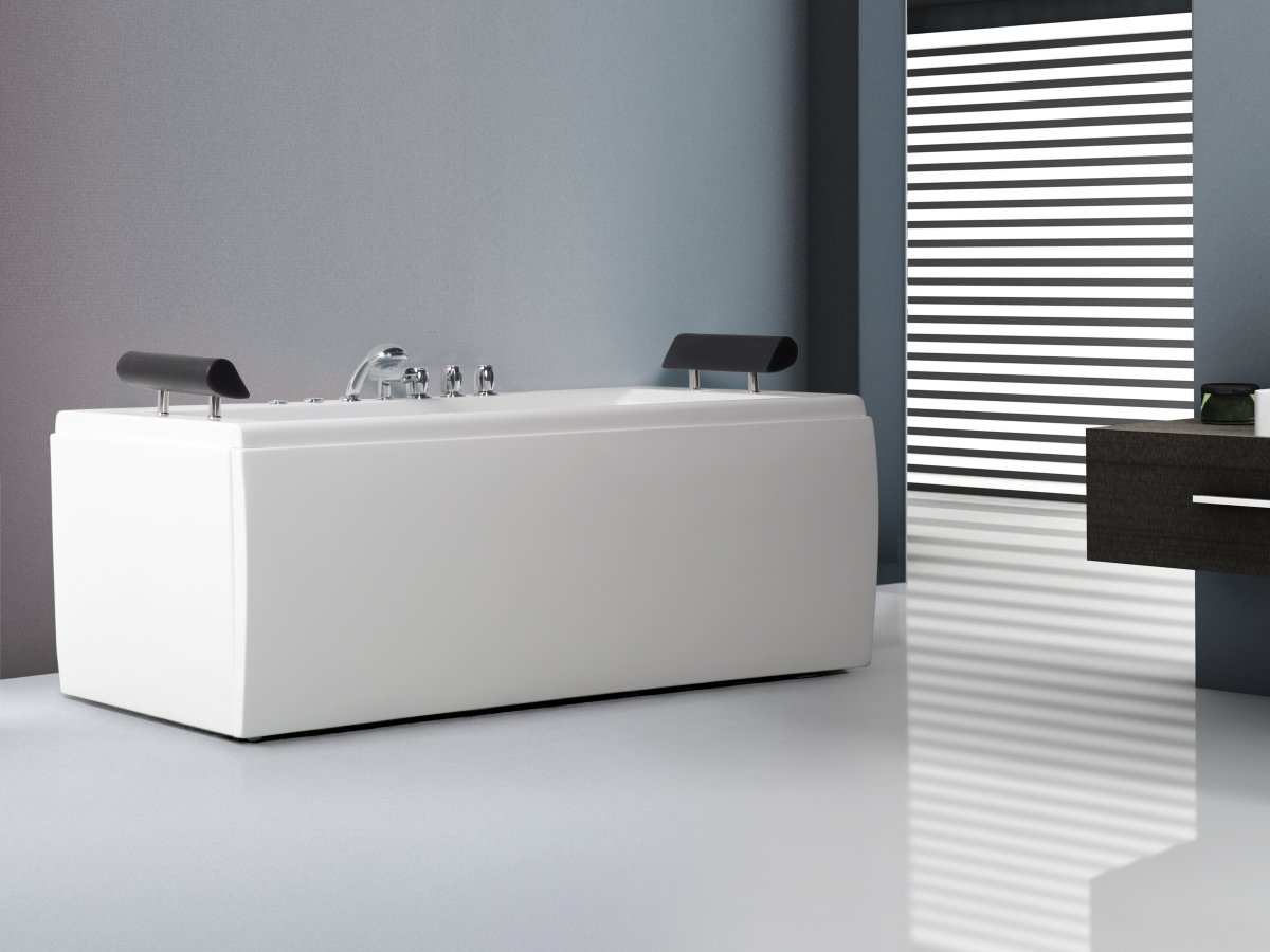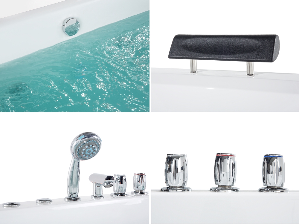- Die luxuriösen Armaturen sind qualitativ anspruchsvoll verchromt, sind sehr übersichtlich in der Anordnung und einfach in der Bedienbarkeit. Der Brauseschlauch der Anti-Kalk Handbrause ist platzsparend in der Wannenverkleidung angebracht und lässt sich leicht zu jedem gewünschten Punkt in der Badewanne herausziehen. Danach kann er wieder in die Vorrichtung zurück. Dadurch wird Sie der Schlauch beim Baden nie stören, wie bei herkömmlichen Badewannen der Fall