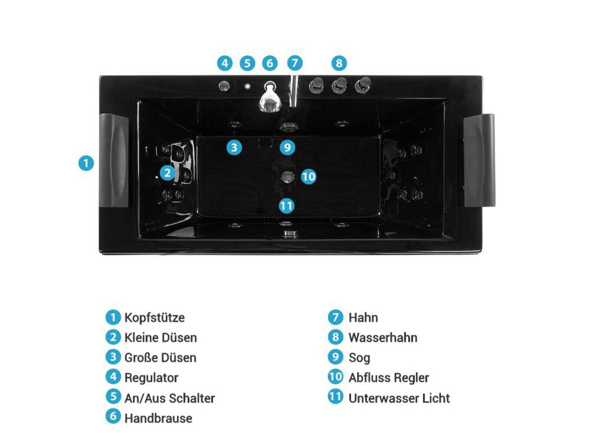 - 10 kraftvolle Rückendüsen massieren mit kräftigen Wasserstrahlen perfekt Ihren gesamten Rücken. Verspannungen und Rückenschmerzen werden so bekämpft und können gelindert werden. Mittels eines drehbaren Armaturenregler, können Sie zusätzlich den Wasserdruck individuell einstellen