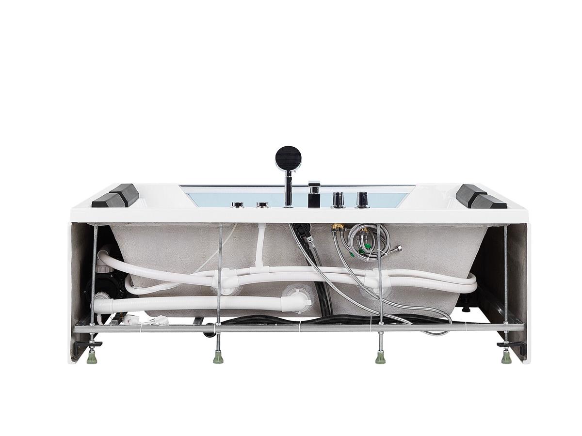 - Die luxuriösen Armaturen sind qualitativ anspruchsvoll verchromt, sind sehr übersichtlich in der Anordnung und einfach in der Bedienbarkeit. Der Brauseschlauch der Anti-Kalk Handbrause ist platzsparend in der Wannenverkleidung angebracht und lässt sich leicht zu jedem gewünschten Punkt in der Badewanne herausziehen. Danach kann er wieder in die Vorrichtung zurück. Dadurch wird Sie der Schlauch beim Baden nie stören, wie bei herkömmlichen Badewannen der Fall