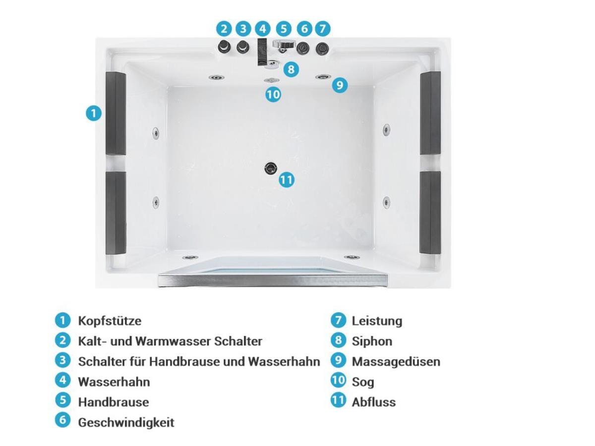 - 4 gepolsterte Kopfstützen sind bei dieser Luxus Badewanne bereits inklusive. Diese sorgen für einen entspannten und bequemen Badespaß