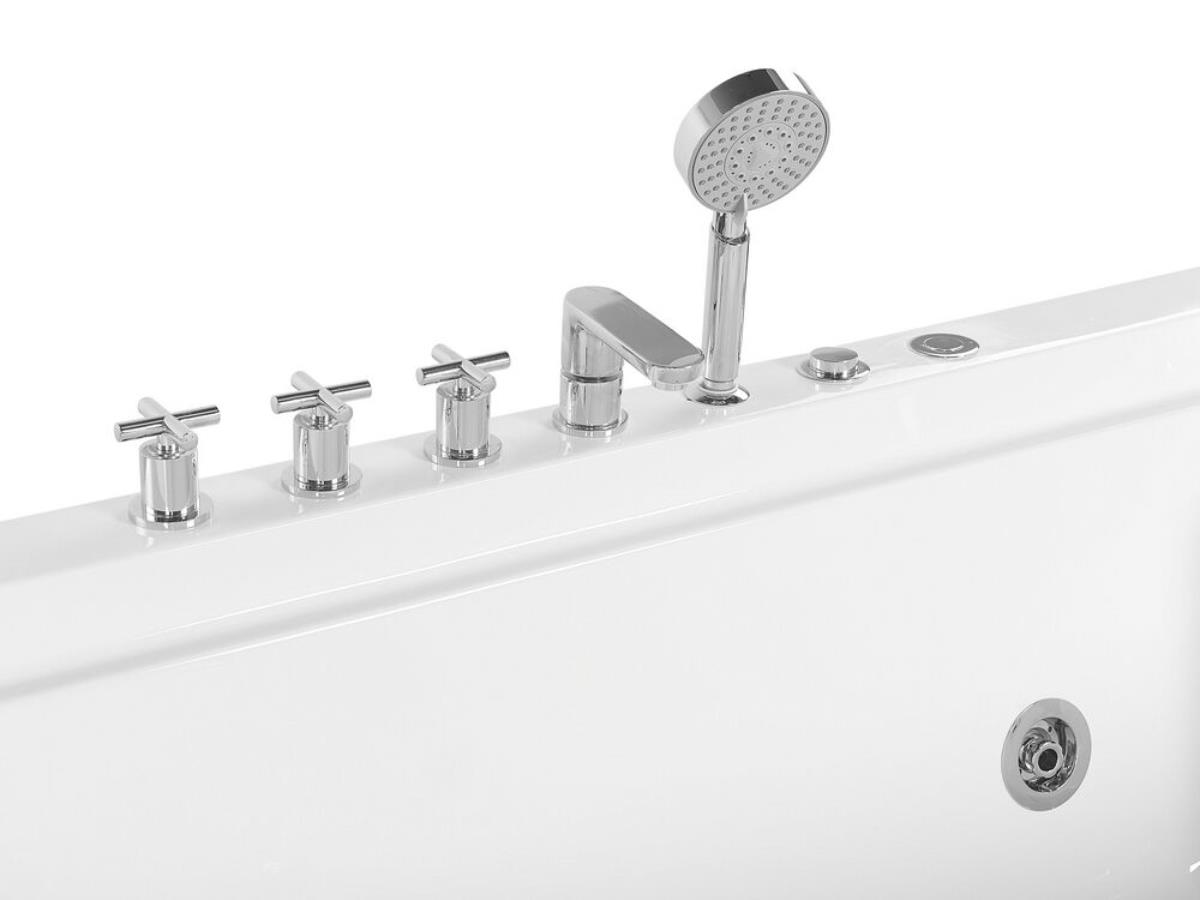 - Die luxuriösen Armaturen sind qualitativ anspruchsvoll verchromt, sind sehr übersichtlich in der Anordnung und einfach in der Bedienbarkeit. Der Brauseschlauch der Anti-Kalk Handbrause ist platzsparend in der Wannenverkleidung angebracht und lässt sich leicht zu jedem gewünschten Punkt in der Badewanne herausziehen. Danach kann er wieder in die Vorrichtung zurück. Dadurch wird Sie der Schlauch beim Baden nie stören, wie bei herkömmlichen Badewannen der Fall