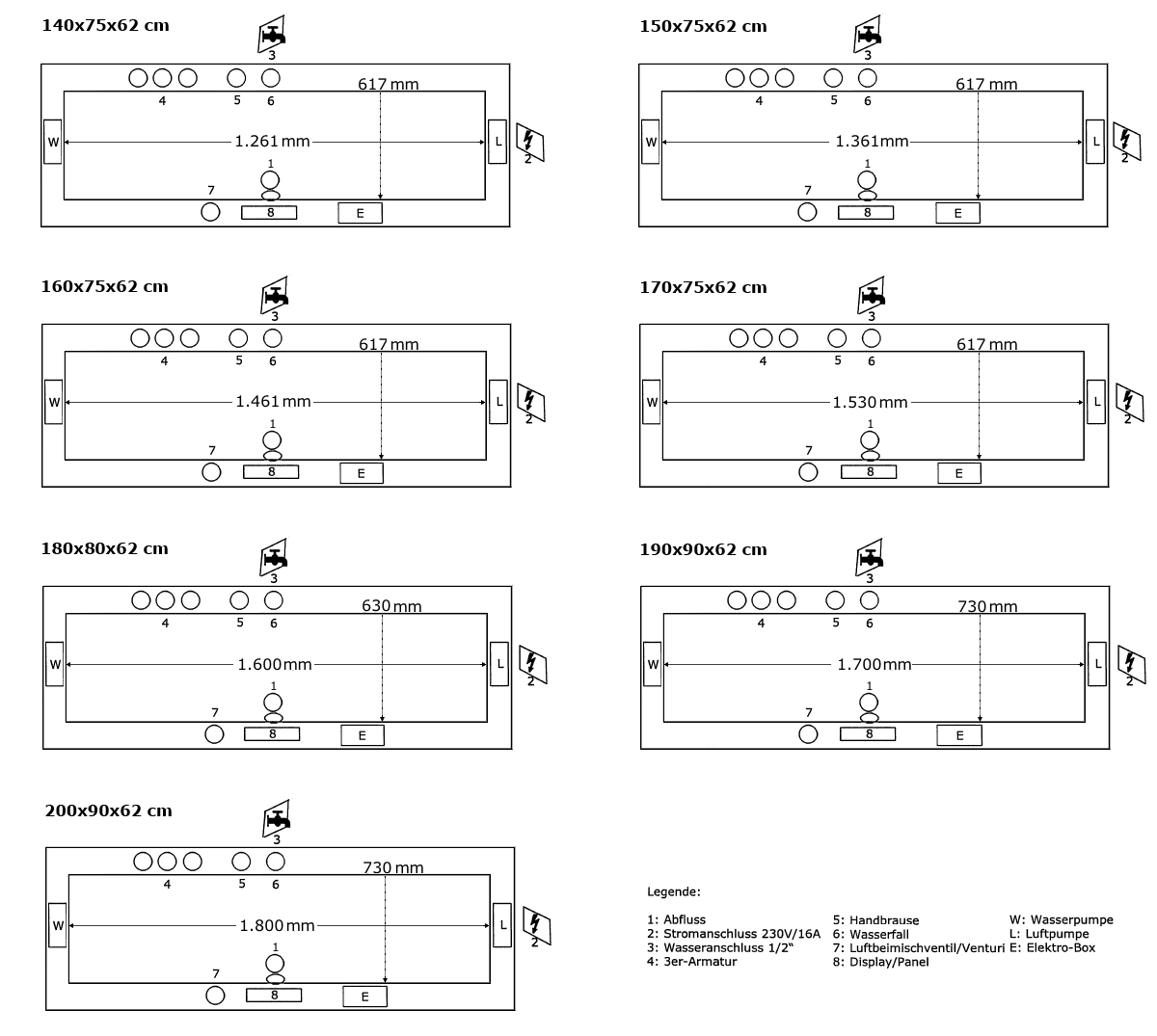 - Mit 22 kraftvollen Massagedüsen bis Größe 170 cm, ab 180 cm 24 kraftvolle Massagedüssen