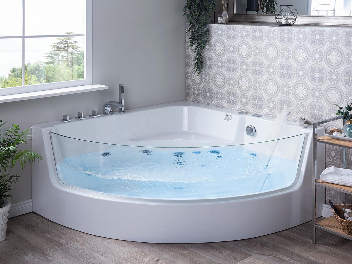 Whirlpool Badewanne Marburg 135x135 cm weiss mit 4 Massage Düsen LED Beleuchtung Glasfront Luxus Glas Spa für Bad