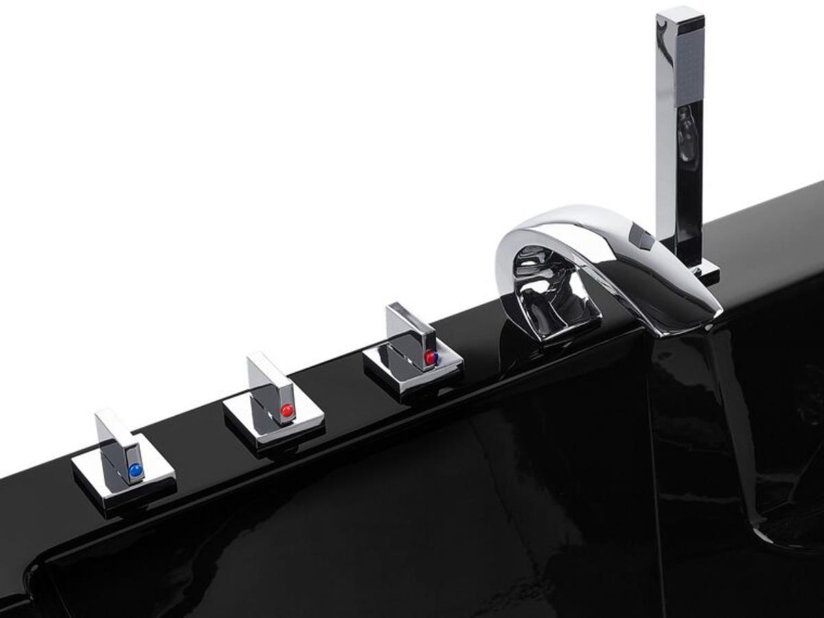 - Die luxuriösen Armaturen sind qualitativ anspruchsvoll verchromt, sind sehr übersichtlich in der Anordnung und einfach in der Bedienbarkeit. Der Brauseschlauch der Anti-Kalk Handbrause lässt sich leicht zu jedem gewünschten Punkt in der Badewanne ziehen. Danach kann er wieder in die Haltevorrichtung zurück.